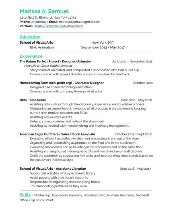 Heyo!My name's Marissa Samuel and I’m a graduate from the School of Visual Arts with a BFA in animation.I like to spend my free time looking for aliens and eating potatoes.I’m currently available for studio and freelance work!Don't be shy, come say hi! ∠( ᐛ 」∠)_